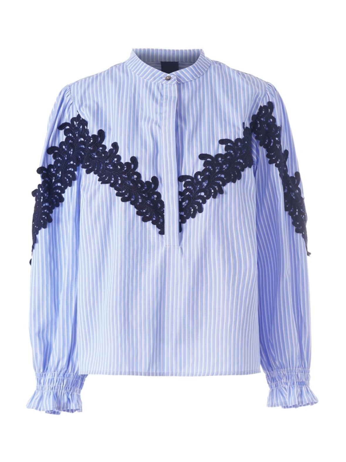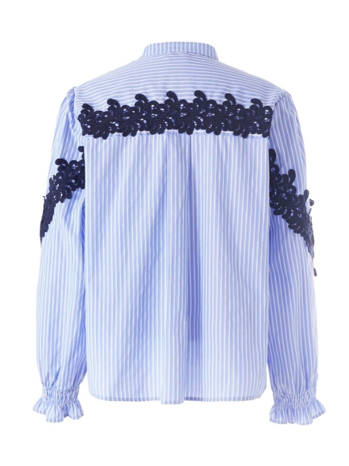 Skjorten har lange ærmer med smockelastik ved håndleddet og et bredt blondebånd i marineblå påsyet henover bryst og ærmer i en let zigzag. Materialet føles blødt og let med en feminin, rolig stemning, velegnet til både hverdag og mere polished styling.