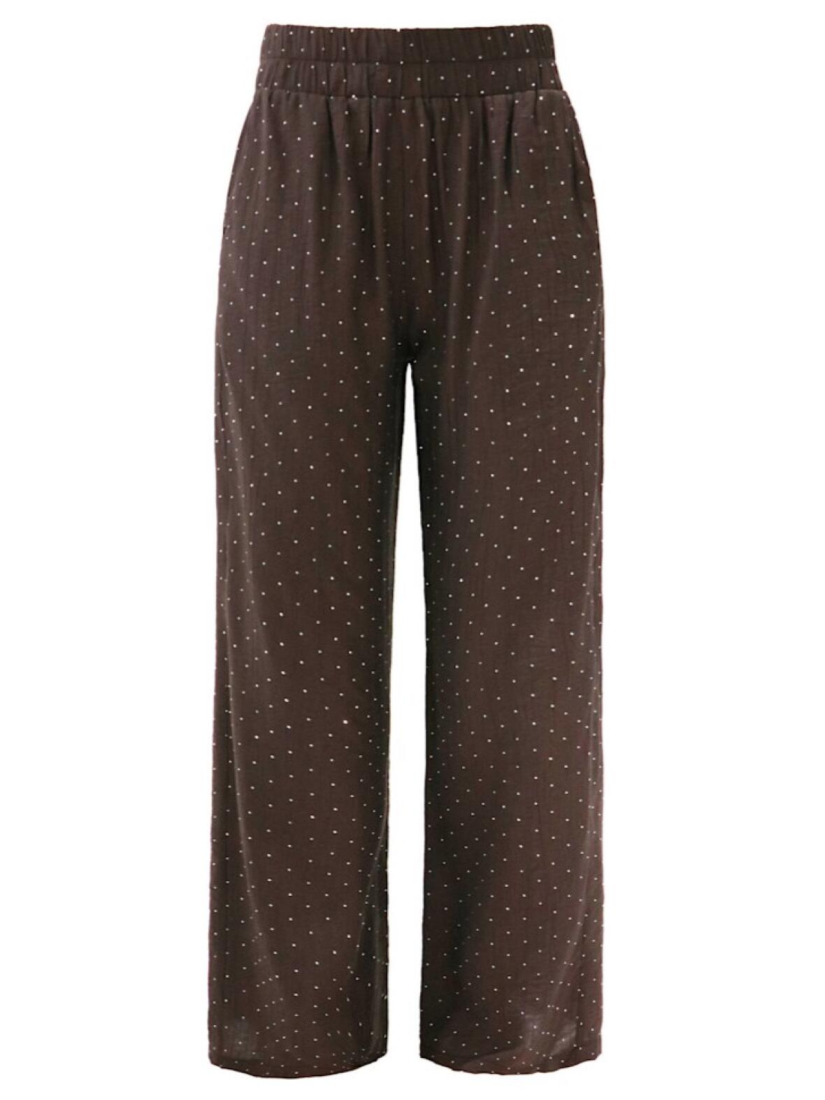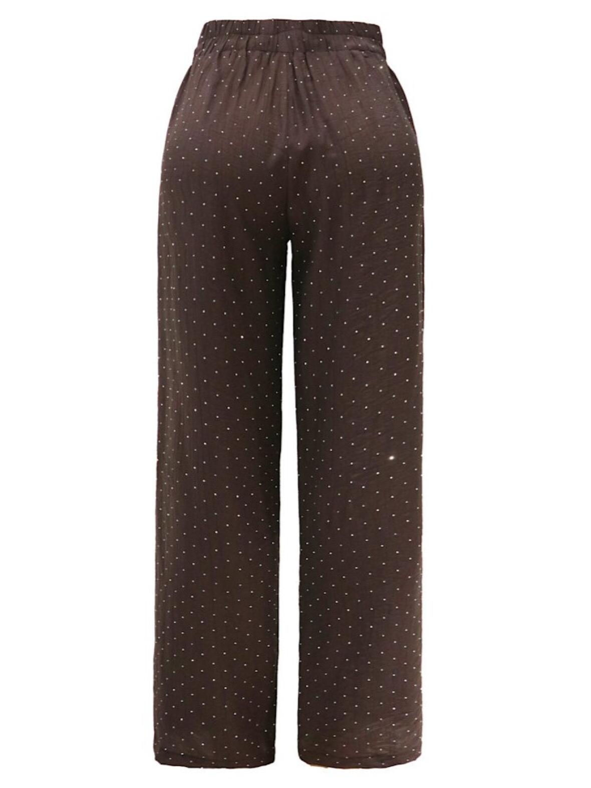 Simi-buksen er udført i en let viscose blanding med små rhinsten fordelt over stoffet, hvilket tilføjer et sart glimt uden at være prangende. Buksen har elastik i taljen, skålommer og lige ben med lidt vidde, hvilket giver en behagelig pasform og en afslappet, sofistikeret stemning.