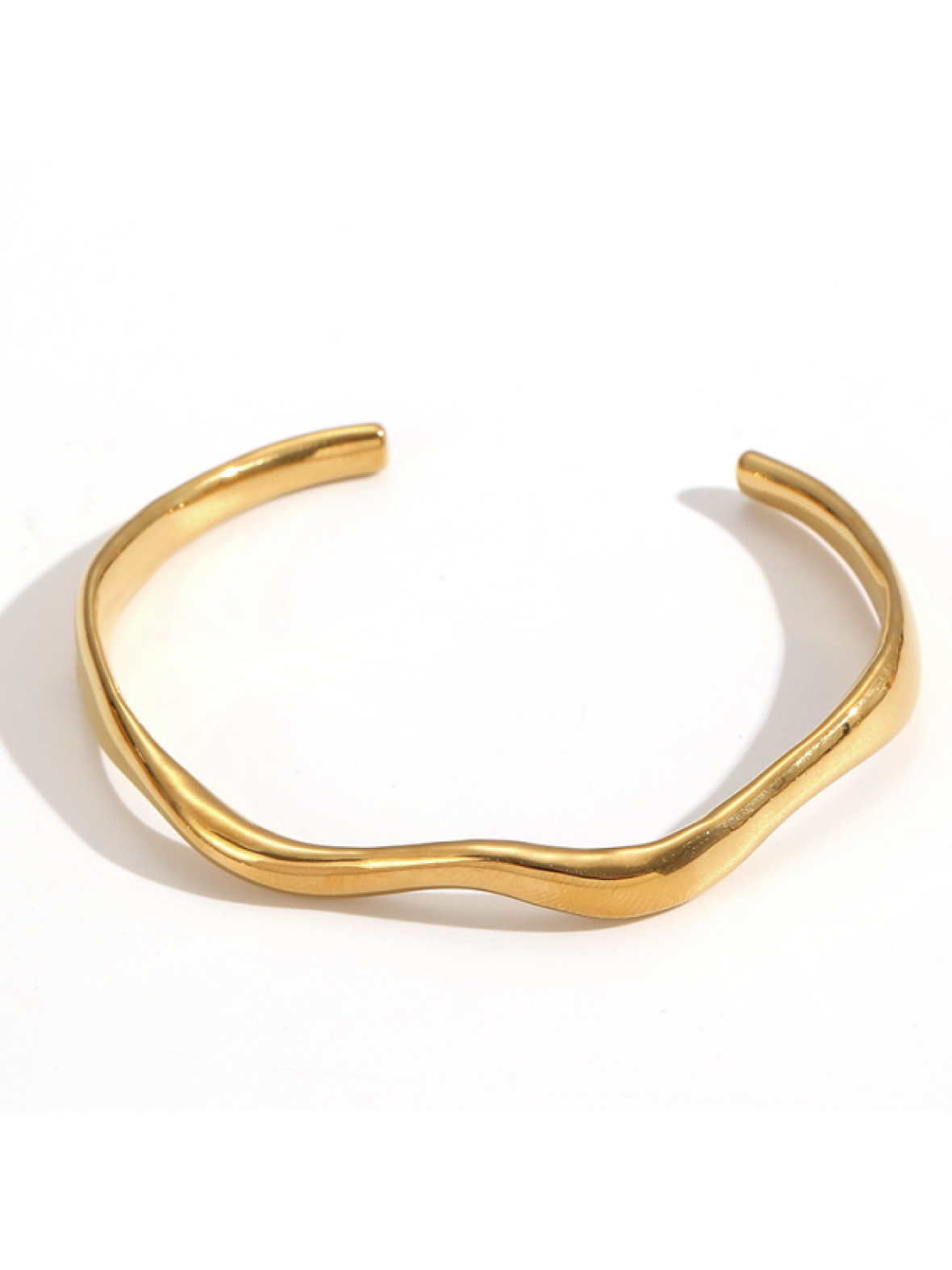 Bølgeformen giver et blødt, organisk udtryk, og armbåndet omslutter håndleddet med lette kurver. Onezise-pasformen gør det nemt at tage på og bære hele dagen, samtidig med at det tilfører et sart, sofistikeret touch til både hverdags- og festlooks.