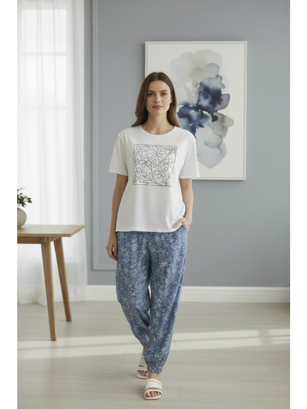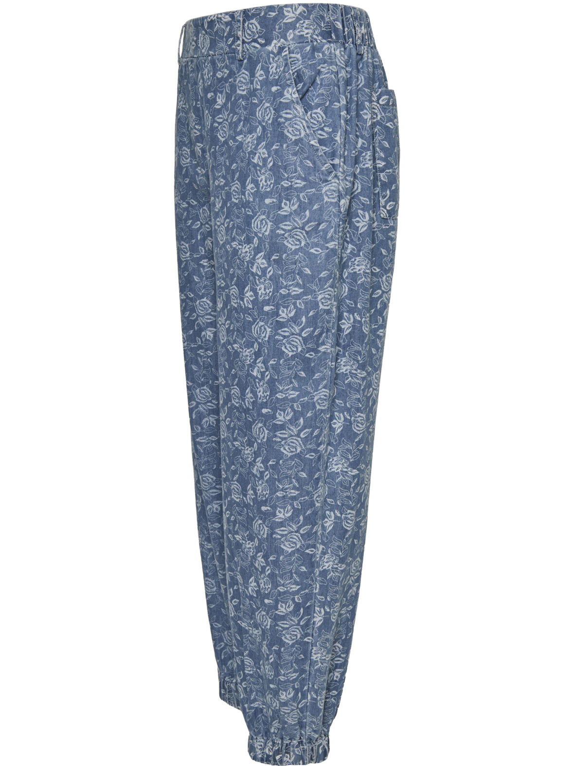 Bukserne har en ballonformet silhuet med fast linning foran og elastik i lænden for god komfort. Bæltestropper og skrålommer giver funktionalitet, mens elastik forneden og ankel længde skaber et let og afslappet udtryk. Denim-looket med det diskrete rosenprint gør bukserne velegnede til både afslappede dage og mere sammensatte outfits, og stoffets sammensætning sikrer bevægelsesfrihed og let vedligehold.