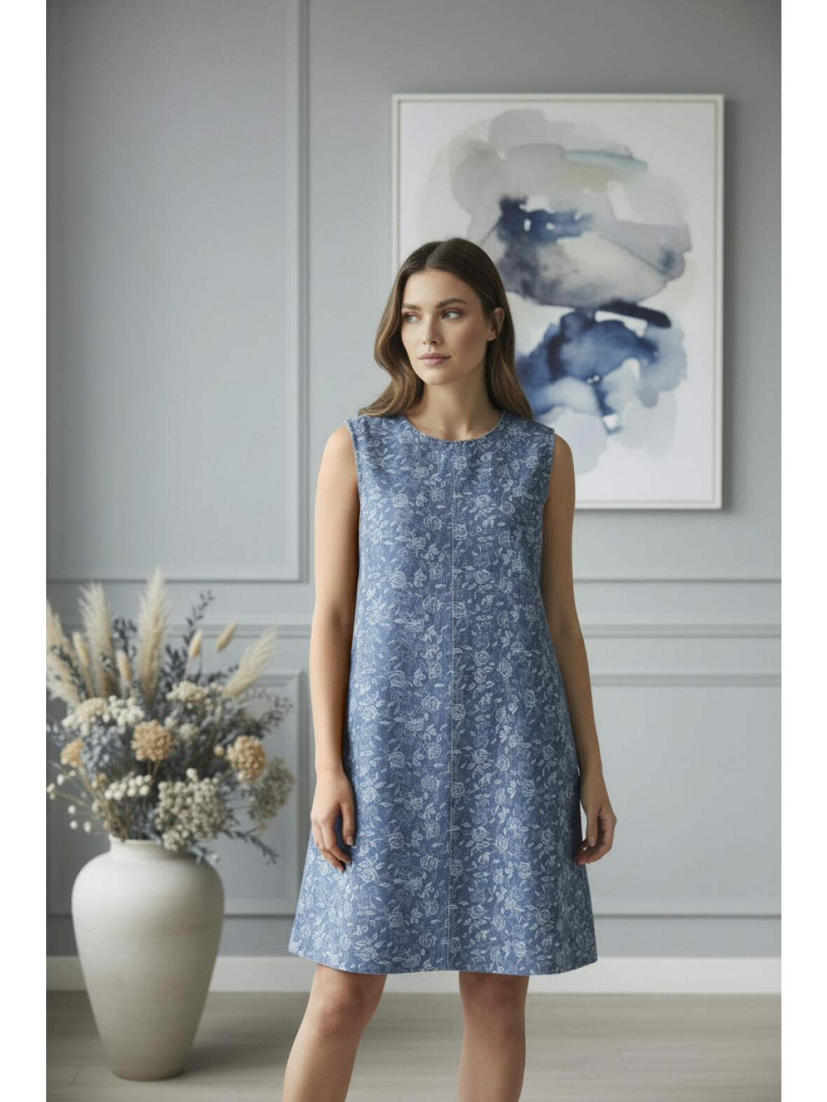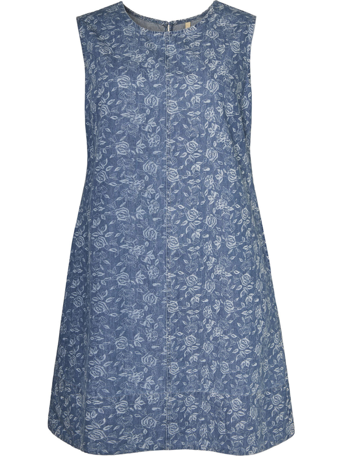 Kjolen har rund hals med slids og en diskret knaplukning i ryggen. Den lette facon er markeret af praktiske lommer i siden og en længde lige ned over knæene, hvilket giver en afslappet og komfortabel pasform. Denim-looket med lyseblå roser tilfører et blødt, nostalgisk touch uden at være prangende, velegnet til både hverdag og lidt mere pyntede lejligheder.
