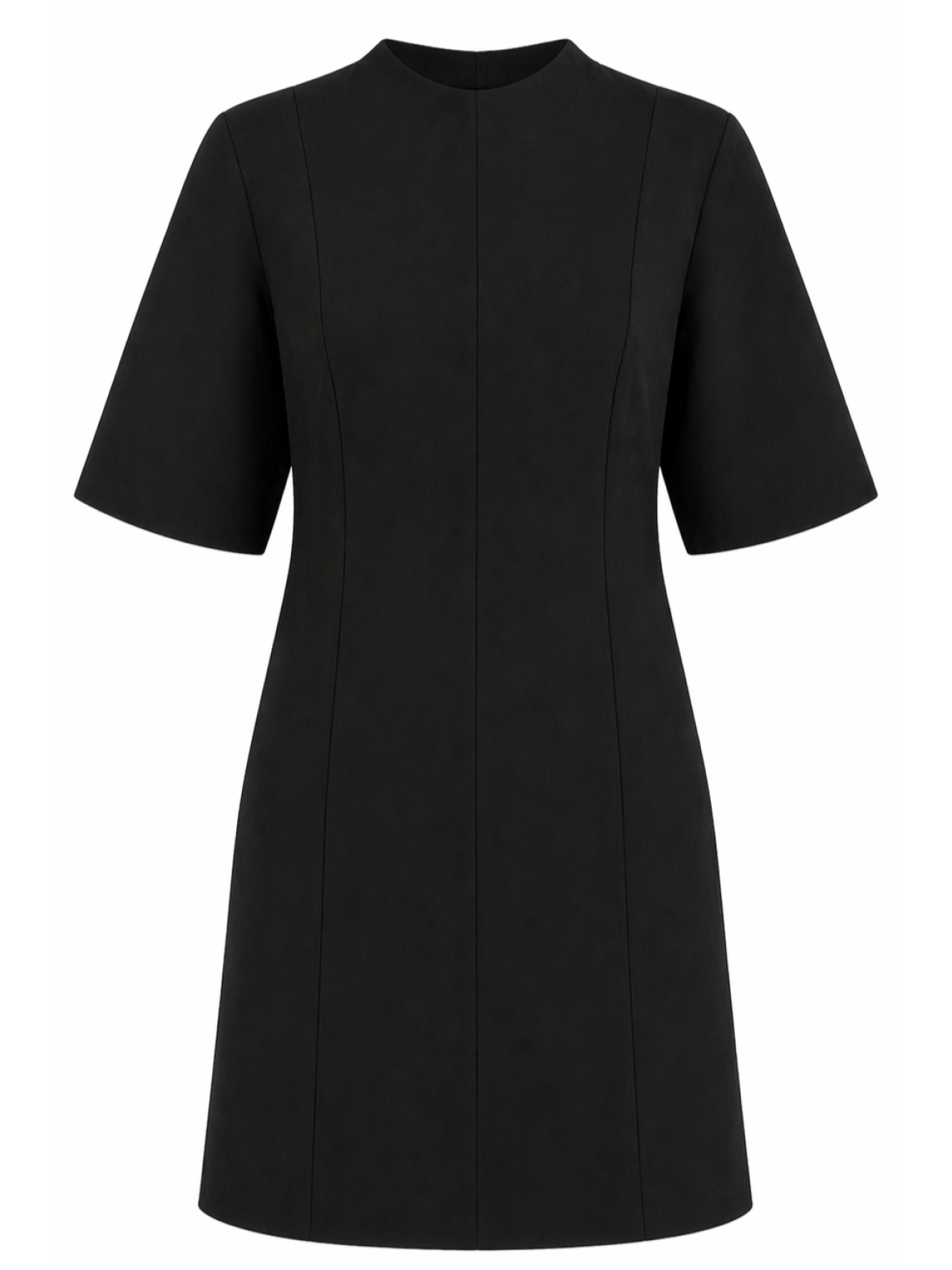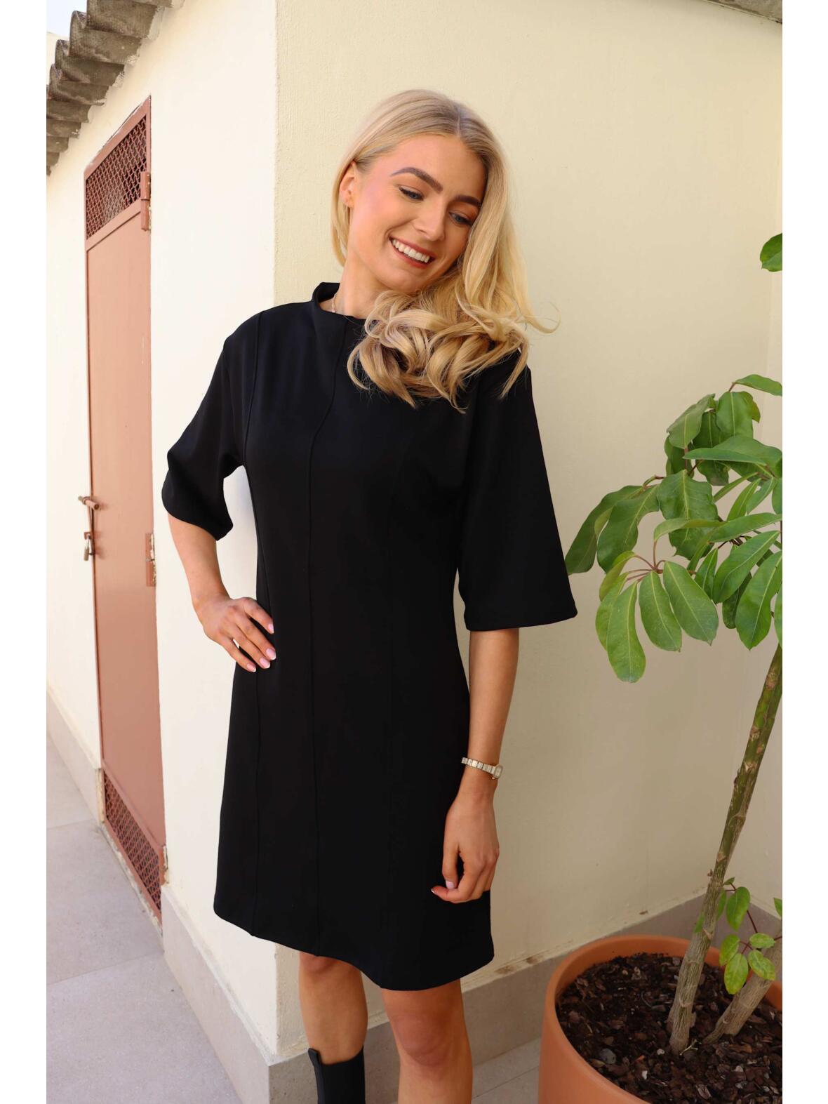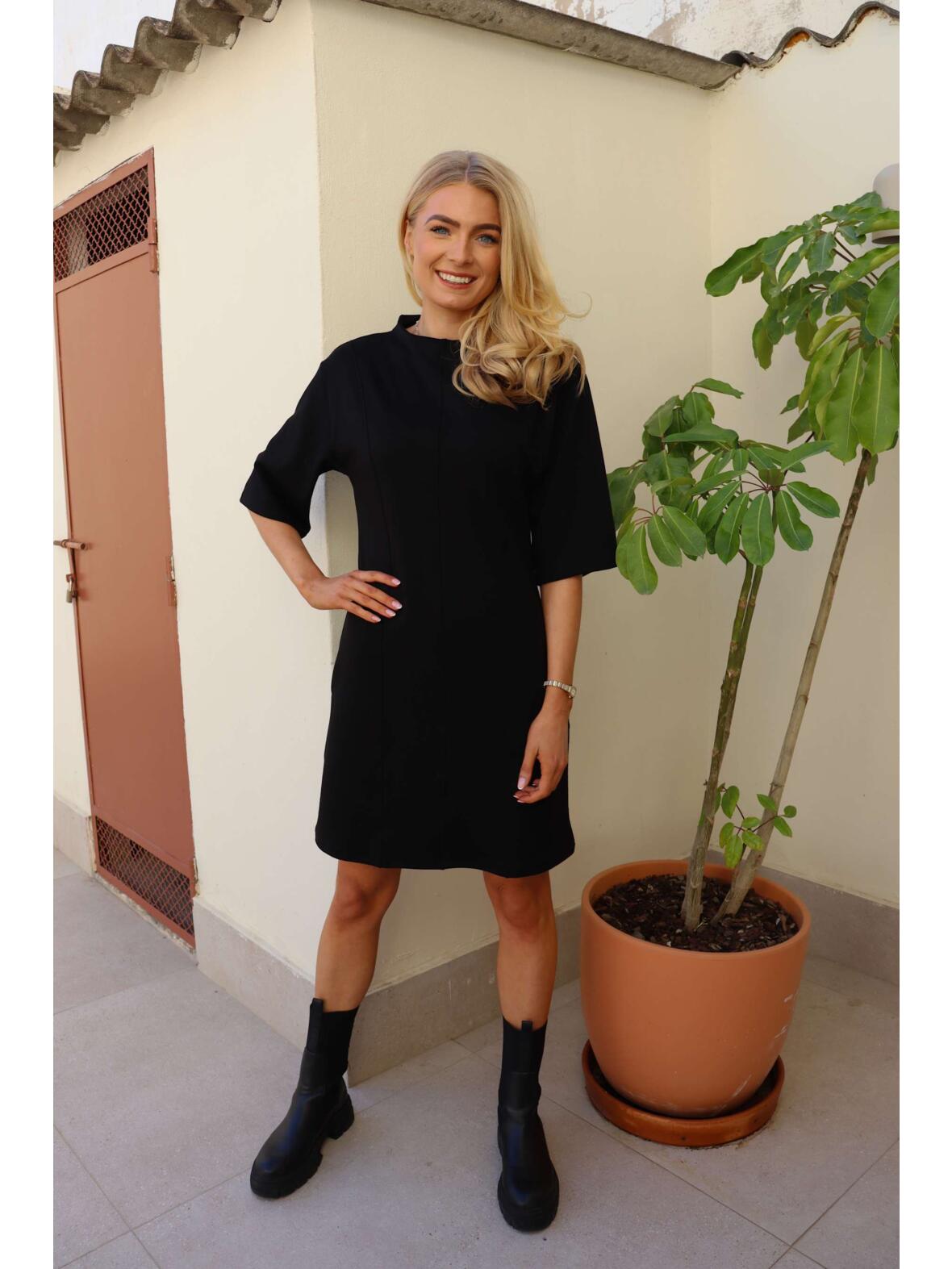 Libertè Essentiel Henny kjole i sort jersey med høj stå halskant og korte ærmer. Kjolen er faconsyet i baner og har ret elastik, hvilket giver en blød, feminin silhuet med længde til knæene. Stoffets bløde fald og enkle linjer skaber en rolig og elegant stemning, velegnet til både hverdag og mere afdæmpede anledninger.