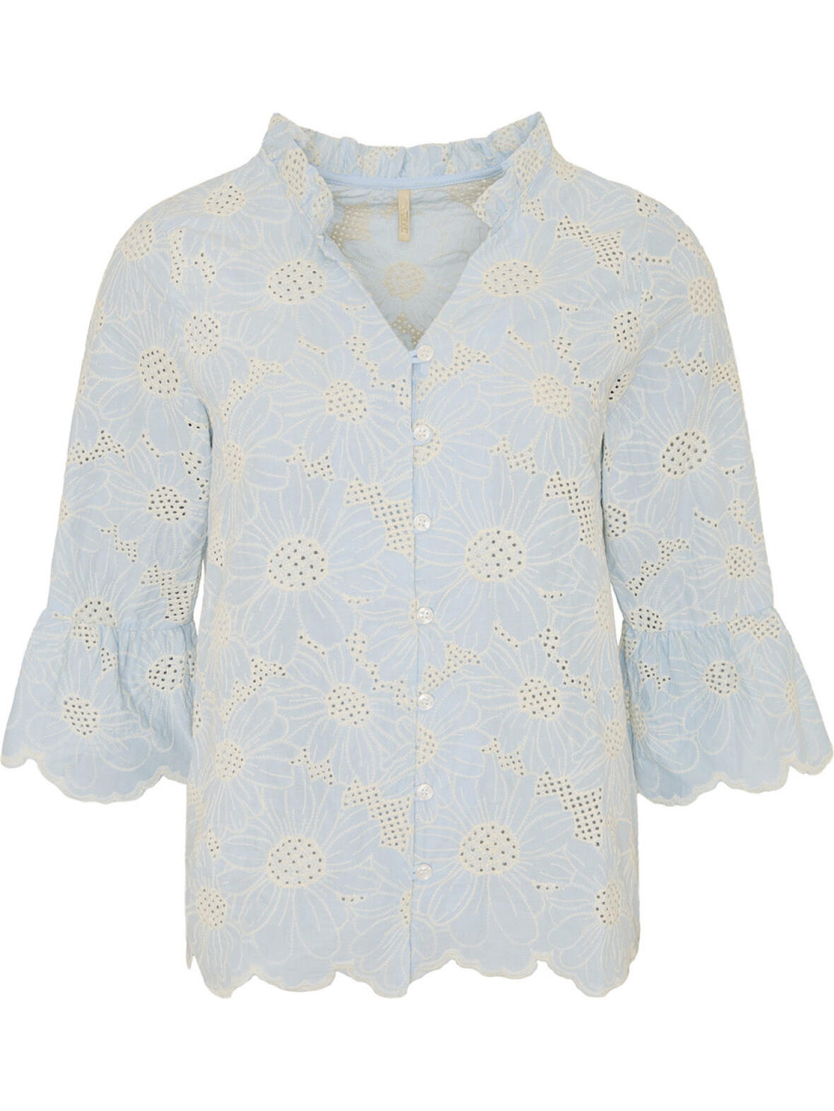 Ofelia Zyra skjortebluse har en feminin V‑udskæring med flæsekant i kraven og en diskret knaplukning foran med trenselukning. Trekvart ærmer er pyntet med flæsekant og afsluttet i en blød bølgekant, som også gentages forneden. Den lyseblå nuance med beige broderi anglais giver et roligt og sart udtryk, og materialet falder let og behageligt.