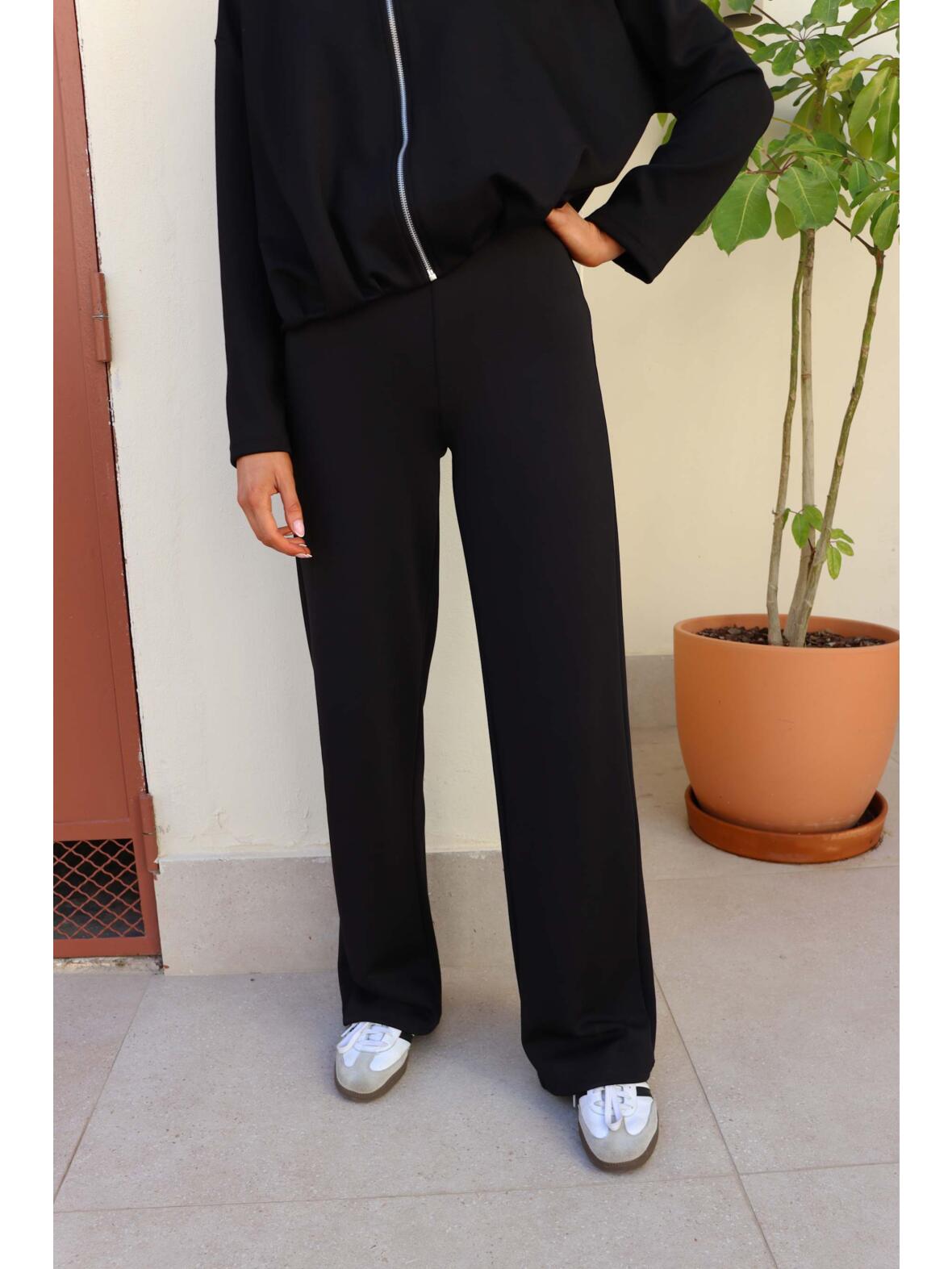 Buksen har bred skjult elastik i taljen og ingen lommer, hvilket giver en glat linje. Moderat vidde hele vejen i benene og en blød, elastisk jerseykvalitet, som sidder behageligt og føles let. Materialet kombinerer drapering og stræk for en afslappet, elegant stemning.