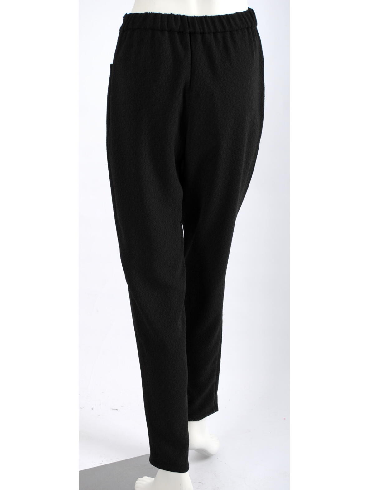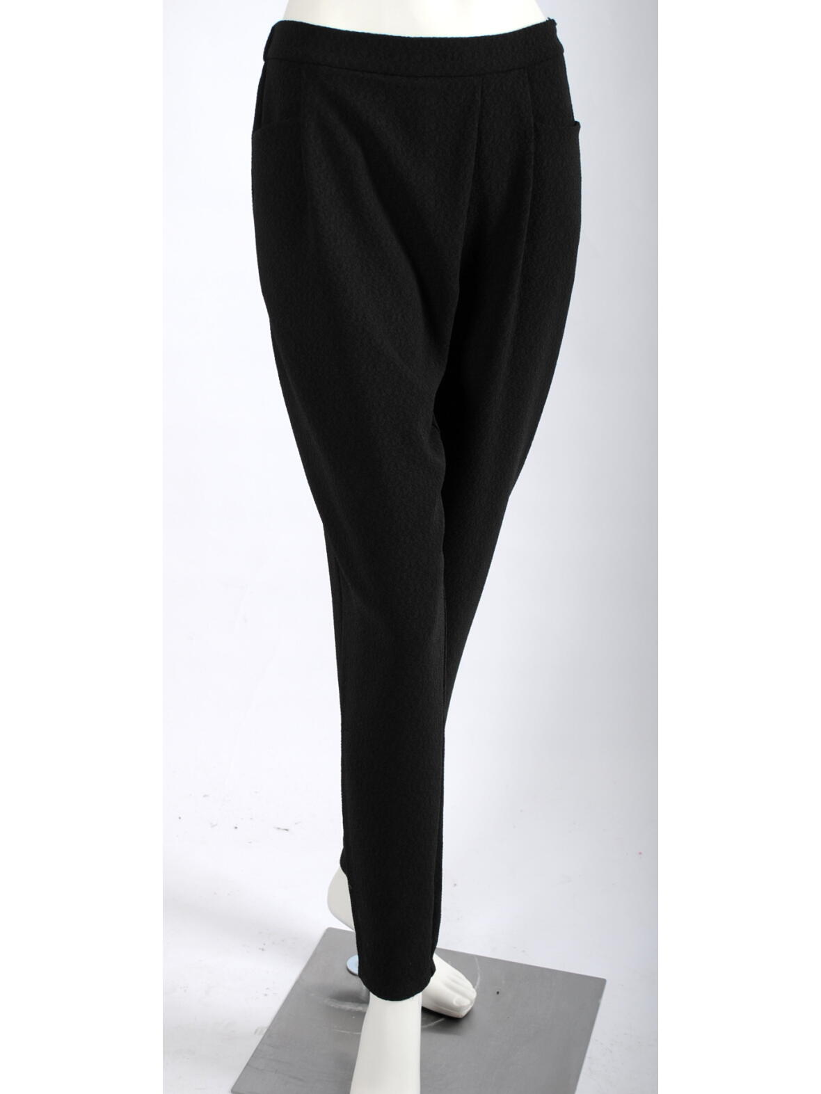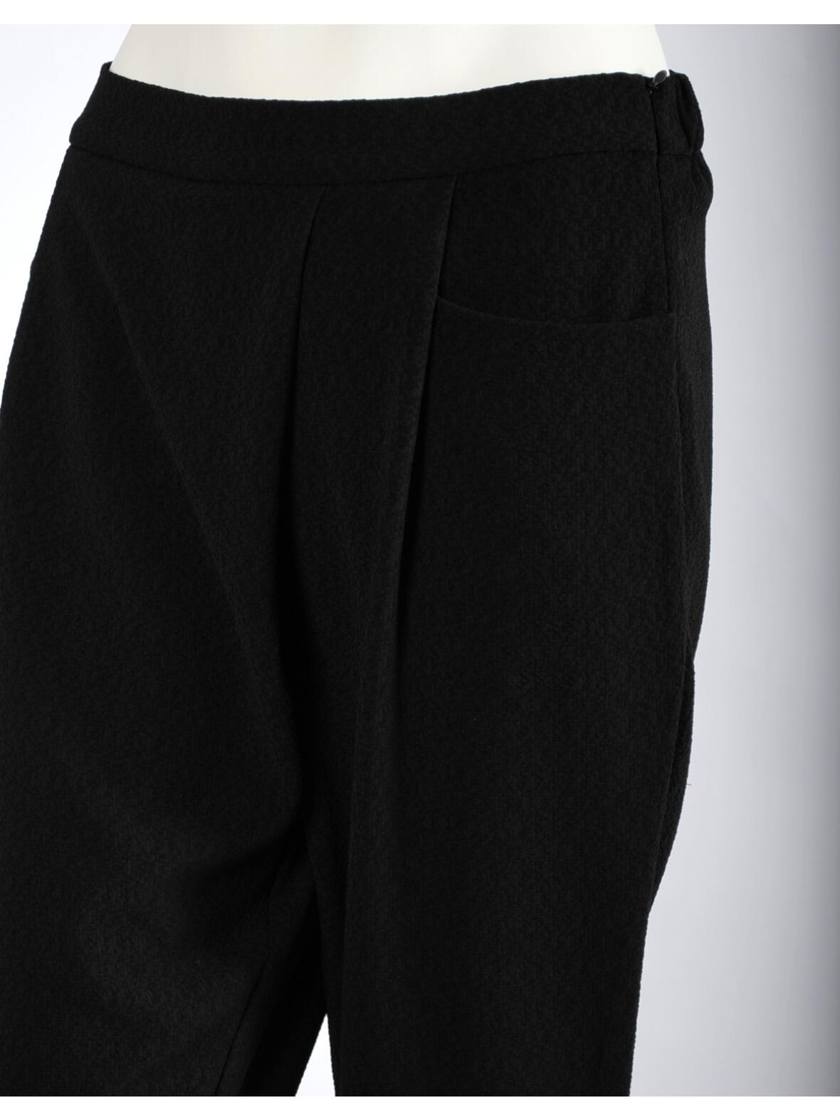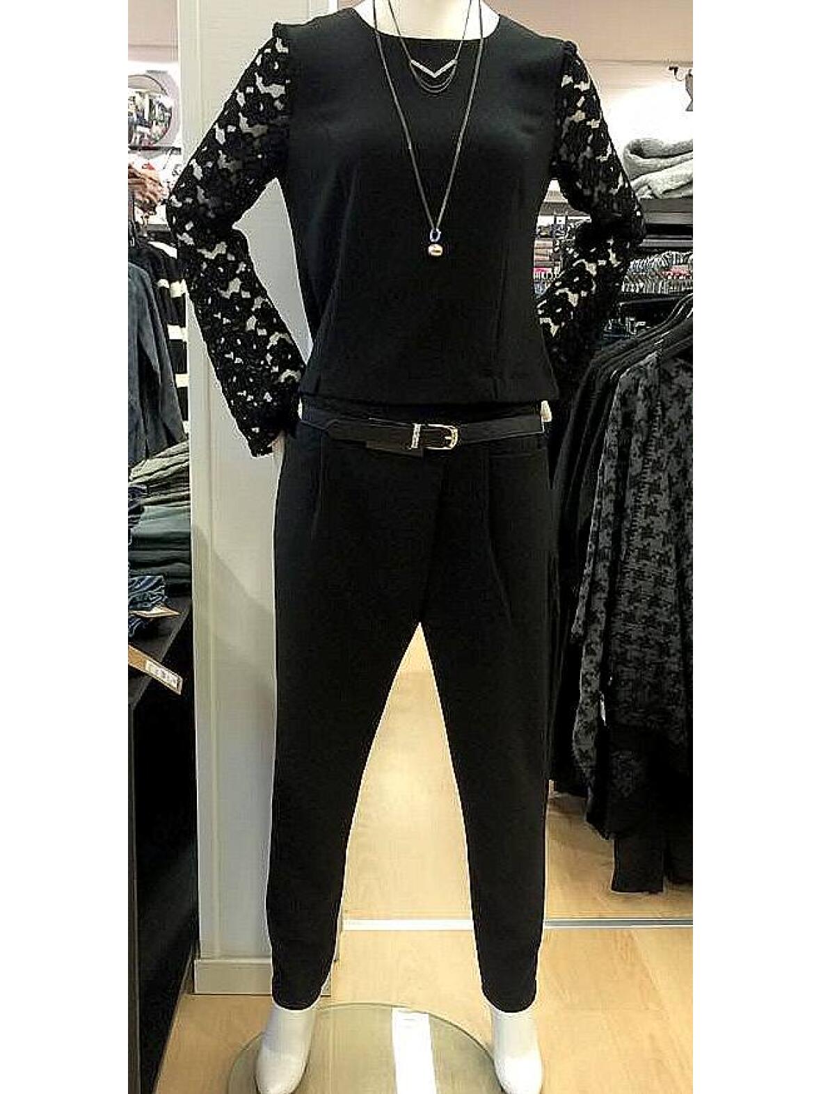 Mongul Ibine boucle buks med fast linning forn, elastik i ryggen og lynlås i venstre side. To lommer foran og asymmetrisk læg foran. 95 % viscose og 5 % elastan. Bukserne passer til Iben blusen med blonde ærmer.