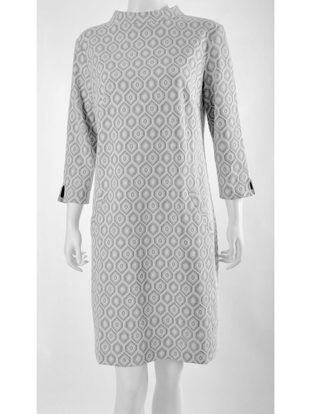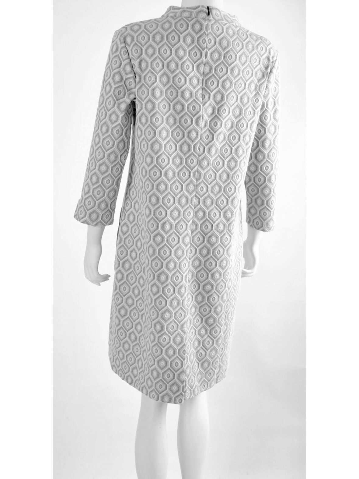 Mongul Pusle kjole med trekvart ærmer, halskant og lynlås i ryggen. Kjolen har klassisk let markeret facon, slids bagpå og to skrålommer foran. Grovt vævet 58 % bomuld, 40 % polyester og 2 % elastan