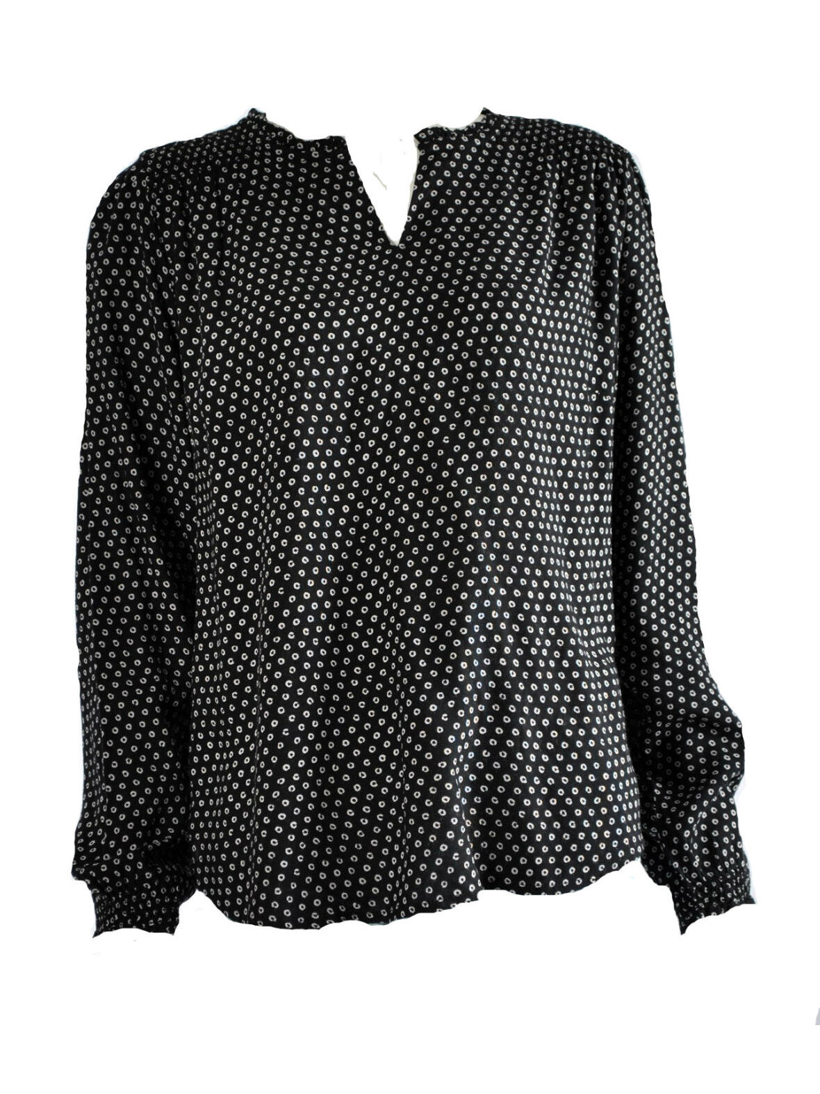 Anny skjorte/bluse fra Marc Lauge. Skjorten er med rundhals med v-udskæring. Smock elastik på skuldrene og smock elastik i begge ærmer forneden. God hoftelængde på skjorten som er lidt længere bagpå end foran. Sort med små hvide cirkler. 100 % viscose. Vask ved 30 grader. Krymp 3 %.