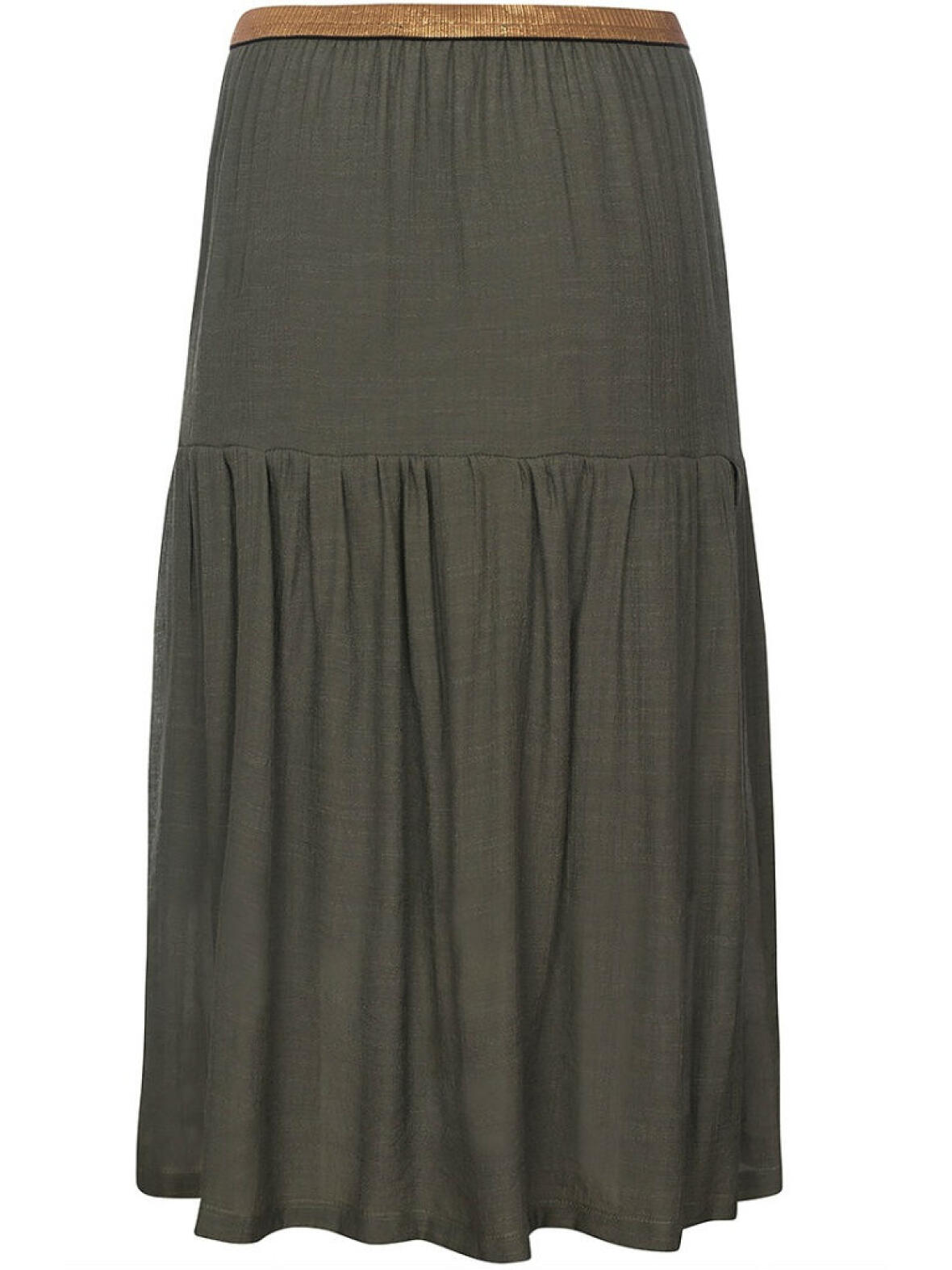 Karitas maxi nederdel med en enkelt flæse. Nederdelen har guld lurex elastikkant foroven. Nederdelen er foret til knæene. Flot oliven grøn farve. Lækker og let kreppet kvalitet. 60 % viscose og 40 % polyester. Vask ved 40 grader. Max krymp optil 5 %.
