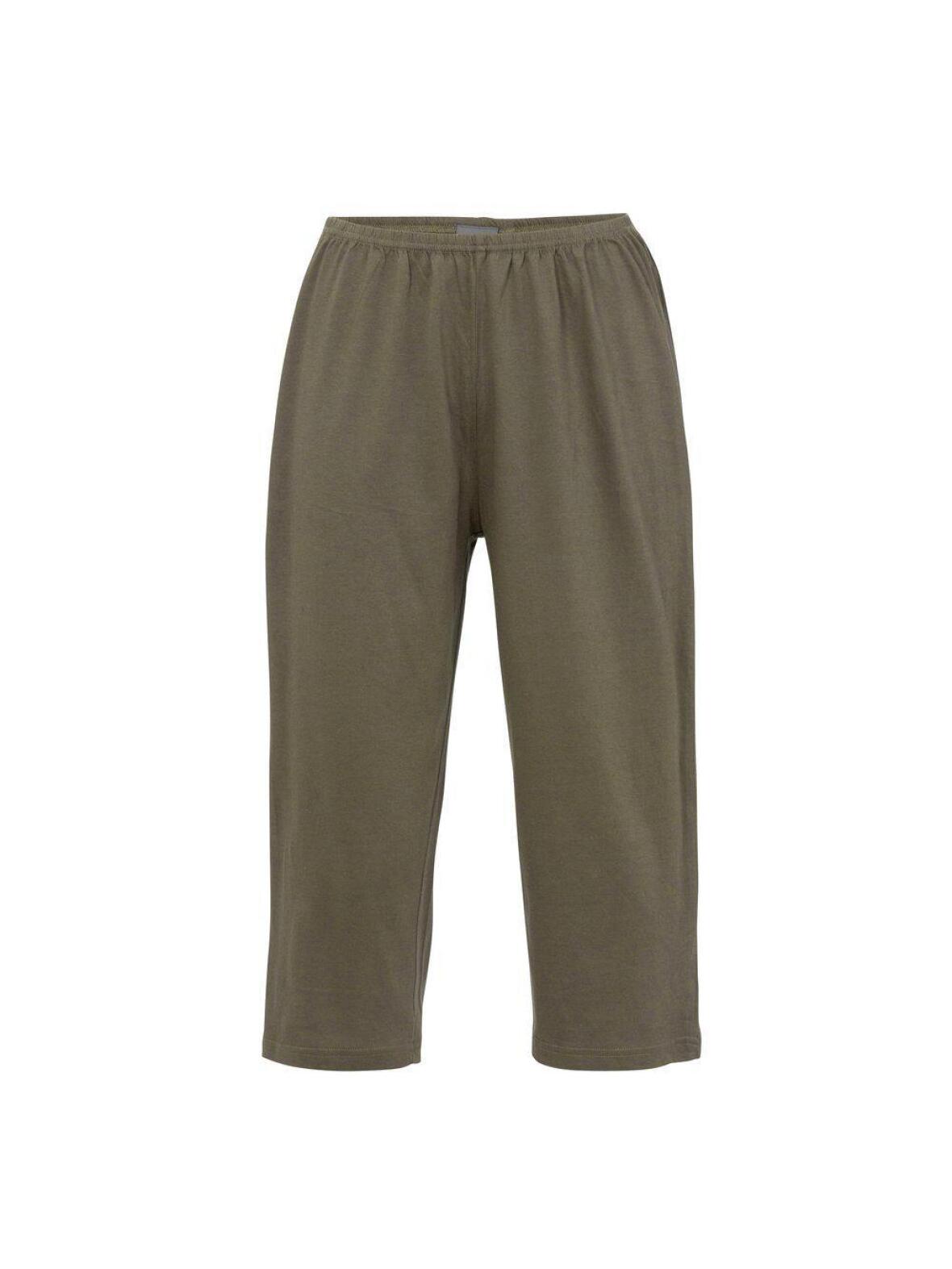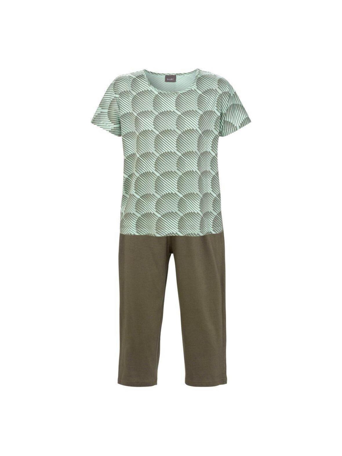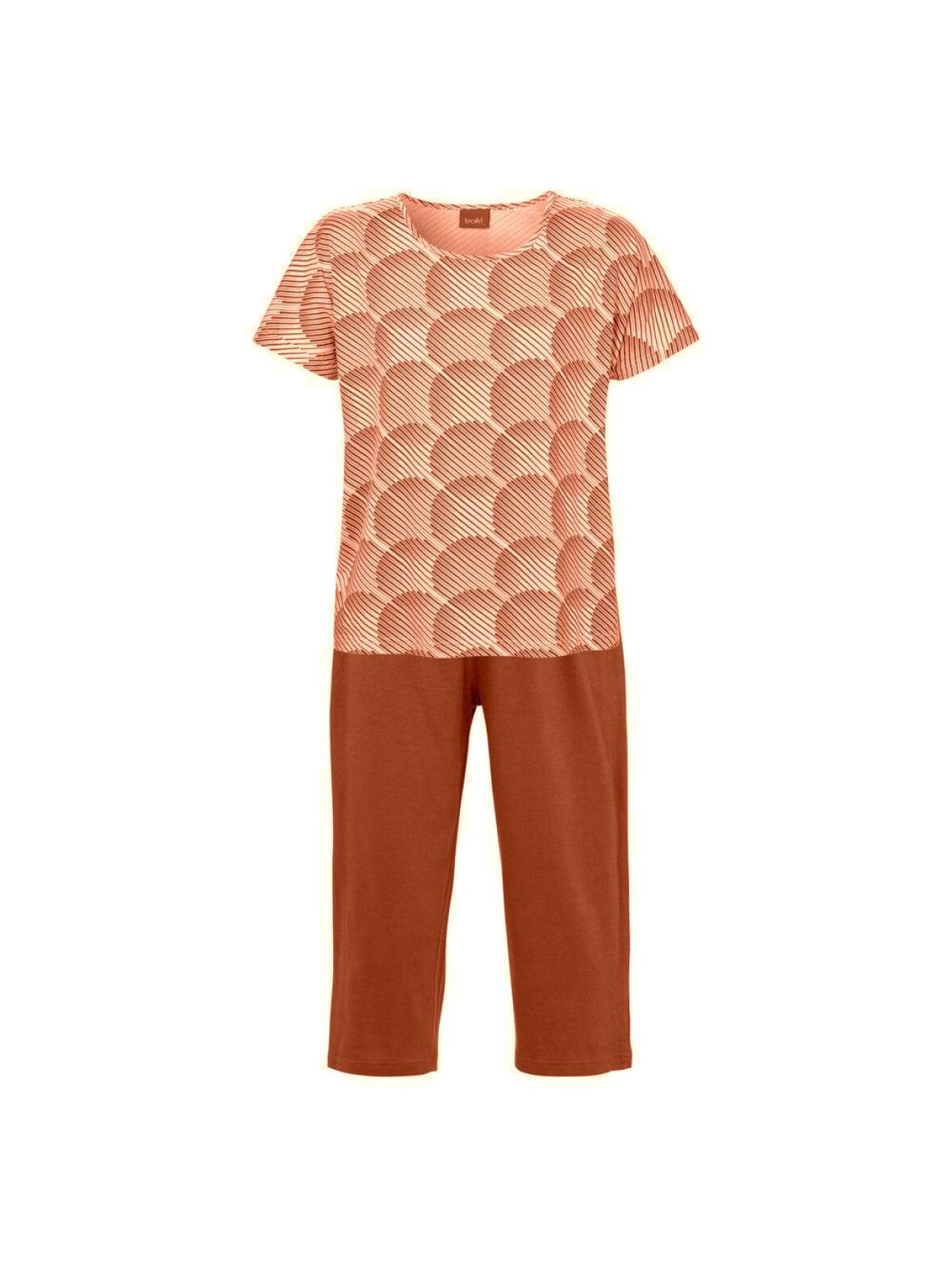 Fin sommer pyjamas fra Trofé. Overdel som kort ærmet t-shirt og buks med elastik i taljen og piratlængde. To udgaver. Armygrøn med mønster af lime i blusen og ensfarvet armygrønne bukser. Mørk orange med lys orange mønster i blusen og ensfarvet mørk orange bukser. 100 % bomuld. Vask ved 60 grader.