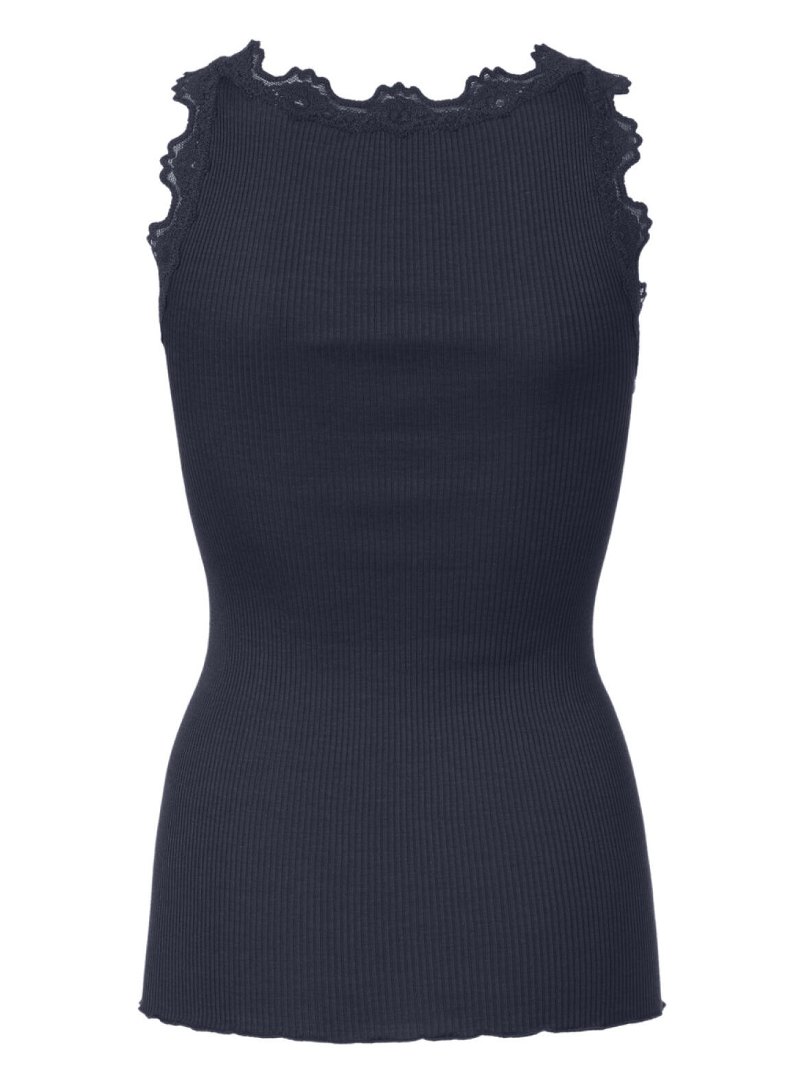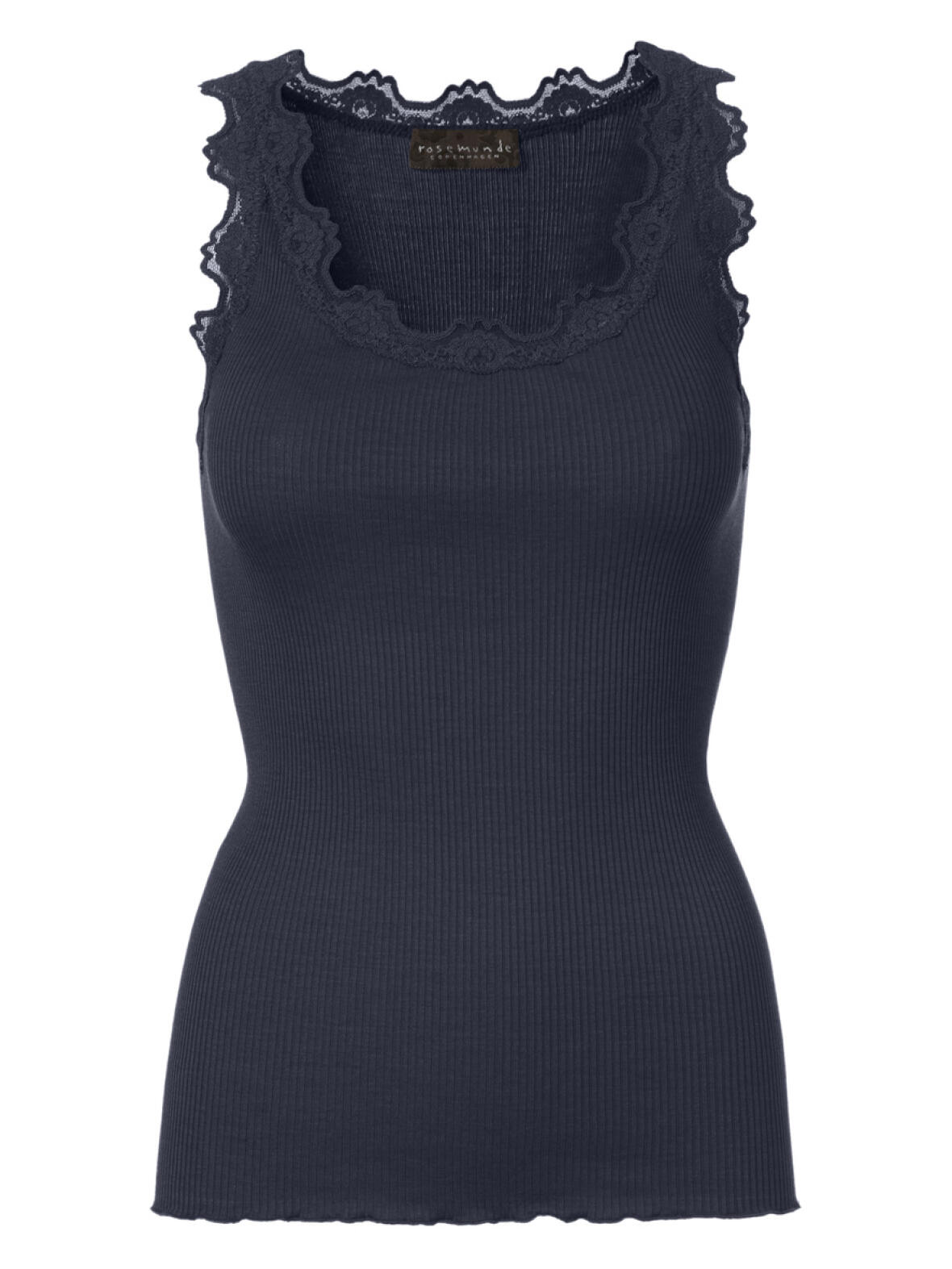 Marine blå Rosemunde rib top med blonde kant i hals og ærmegab. Tætsiddende model. Rund strikket tube top i lækker kvalitet i 70 % silke og 30 %. Vask ved 30 grader finvask. Max krymp 5 %.