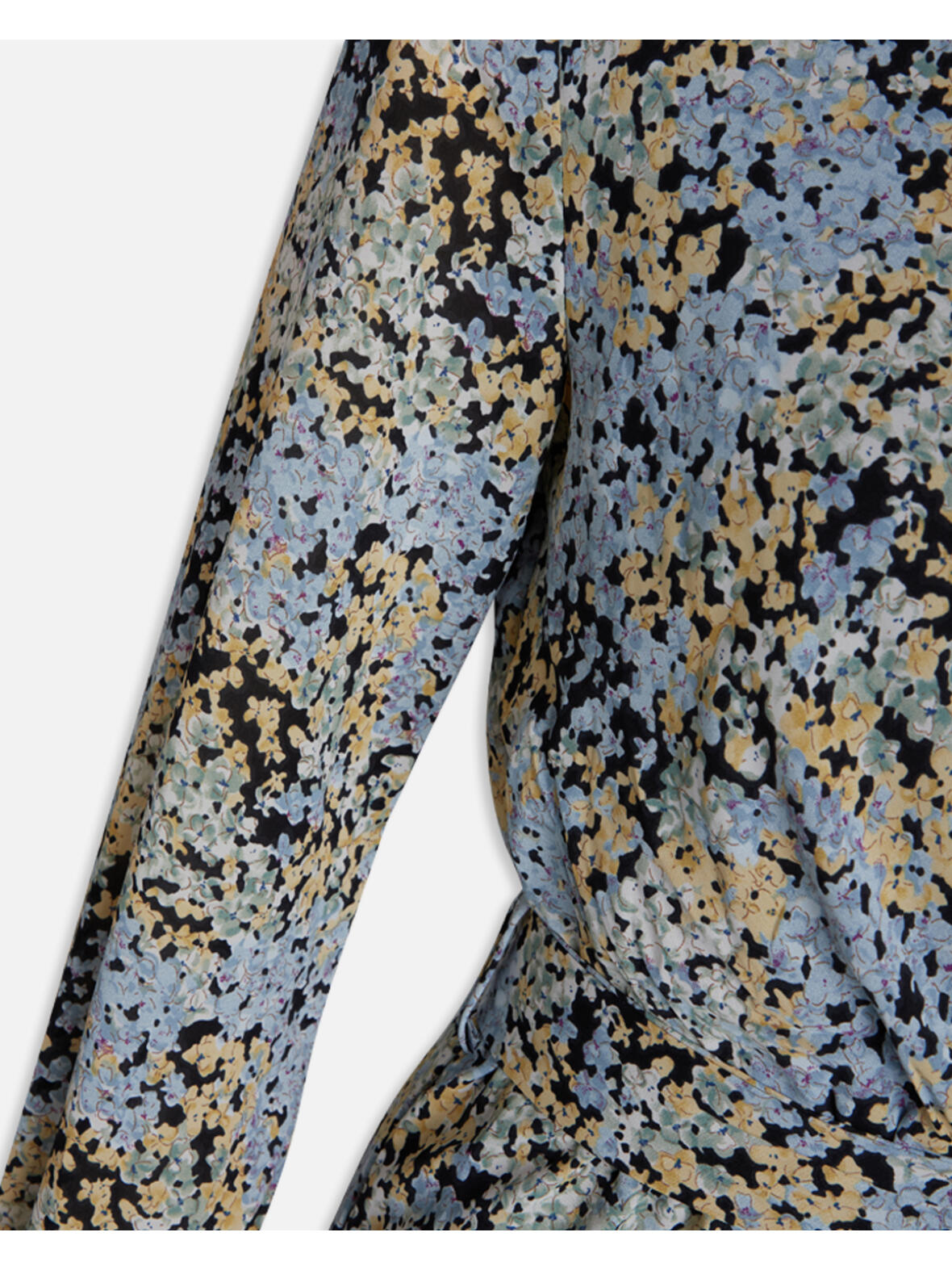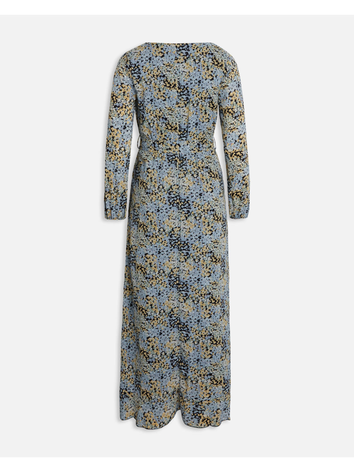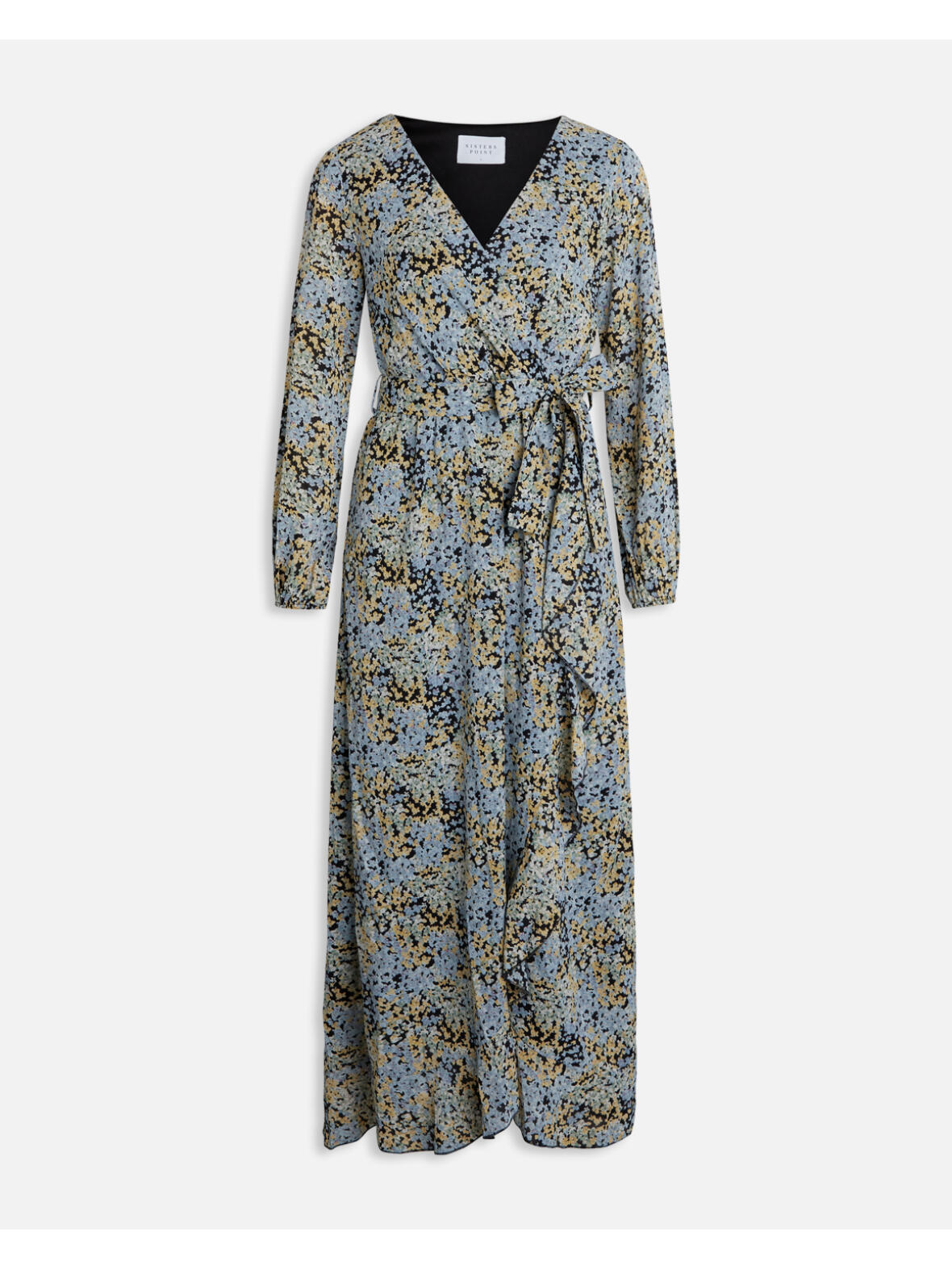 Sisters Point lang kjole med sort bund og mønster i lyse grønne, bå og gule nuancer. Kjolen er med fastsyet slå-om effekt hele vejen ned. Den er skåret med elastik i taljen, hvor den også har et aftageligt bindebælte. Kjolen er gennemforet, bortset fra i ærmerne. Med lange løse ærmer somhar elastik forneden. Underkjolen er i elastisk stof. Lavet i 100 % polyester. Vaskes ved 30 grader