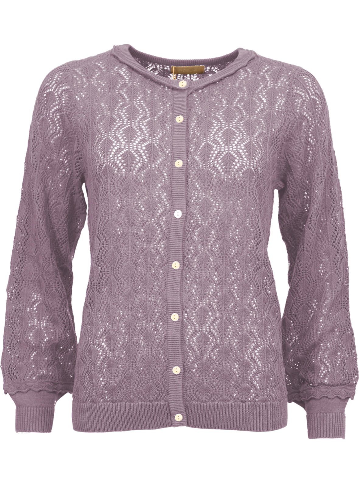 Violet Ofelia Allison strik cardigan med lange ærme med let ballon effekt, rund hals og knapper ned foran. Cardiganen er strikket i fint hulmønster og har lille flæsekant ved ærmerne og rundt i halsen. Ribkant forneden. 50 % bomuld og 50 % akryl. Vask ved 40 grader. Max krymp 5 %